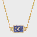 Embrace the beauty of the night sky with the Moonlit Sky Necklace from our Magic Moments Collection. This elegant piece features a crescent moon surrounded by sparkling stars in a rich enamel design. Set in shiny gold, it adds a touch of celestial magic to any look, perfect for those who dream with their heads in the clouds.